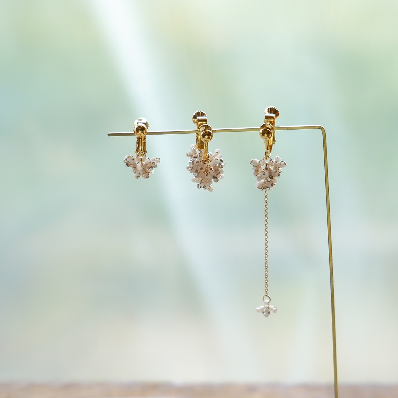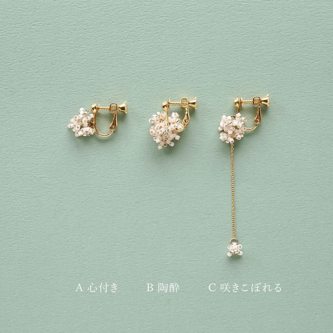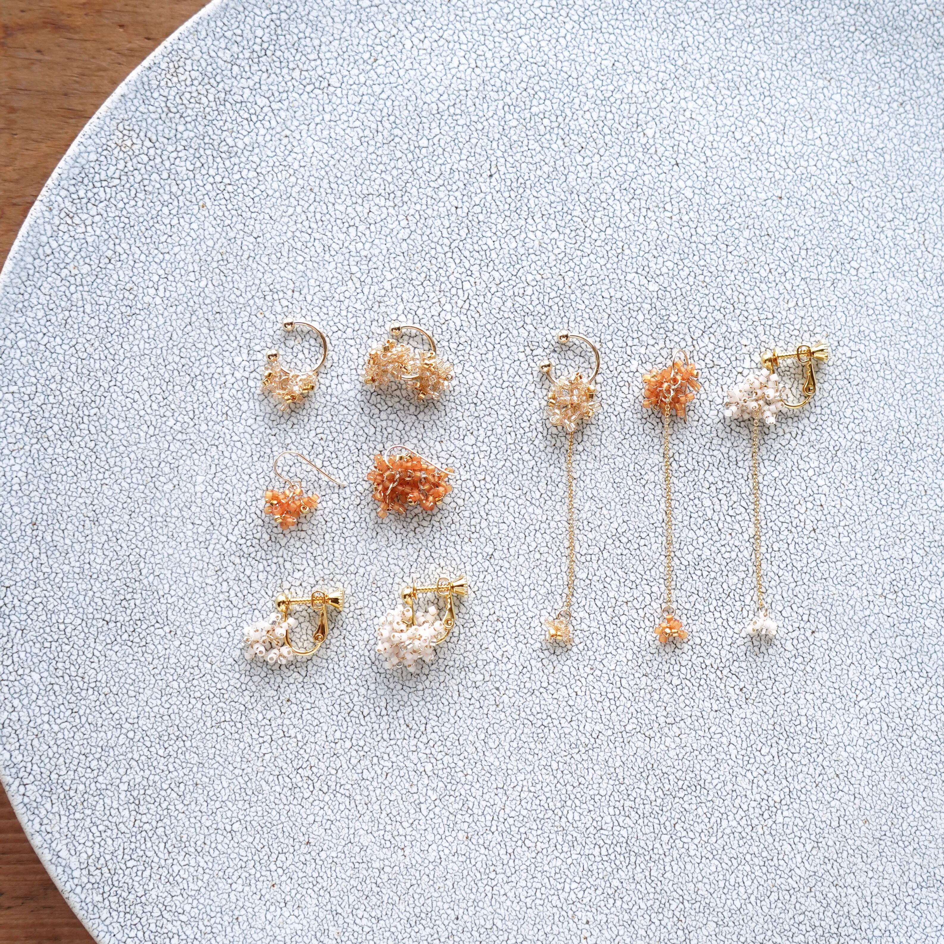 銀木犀の花弁をビーズでかたどって、耳元でささやかに揺れる3つのデザインで表現しました。
