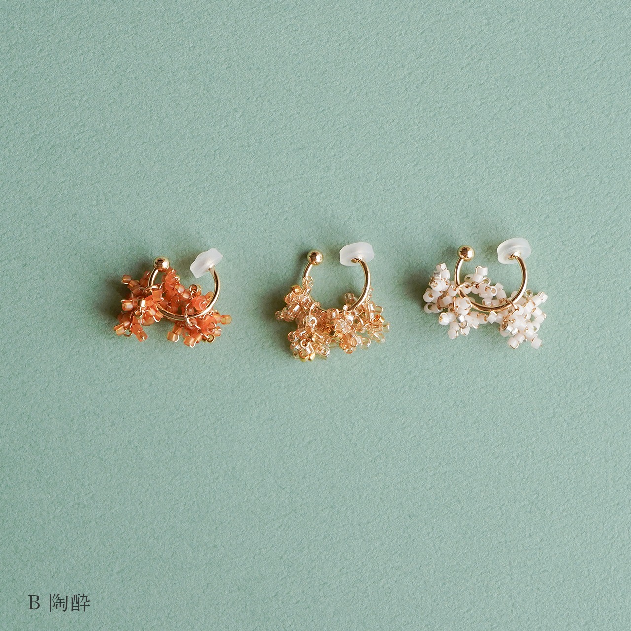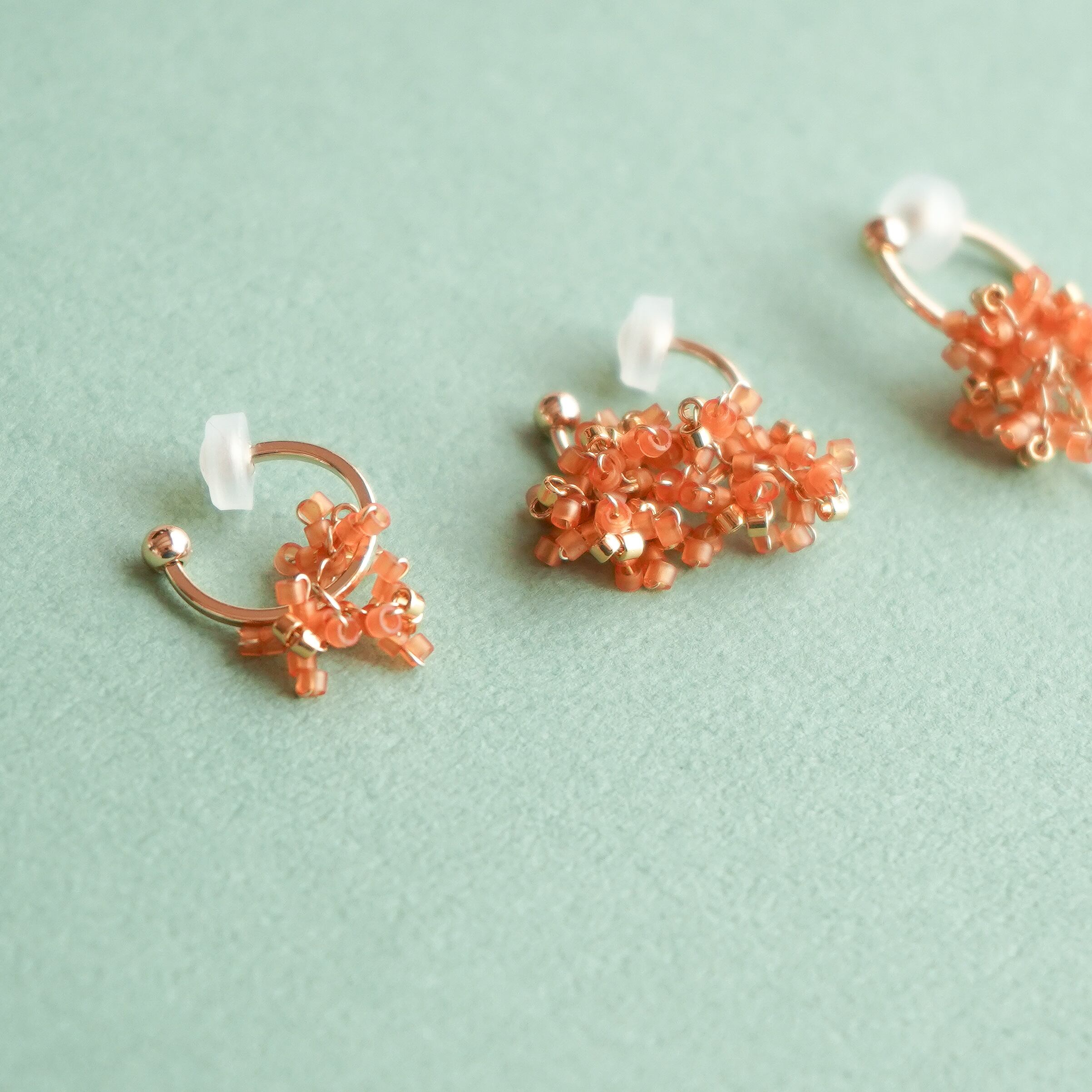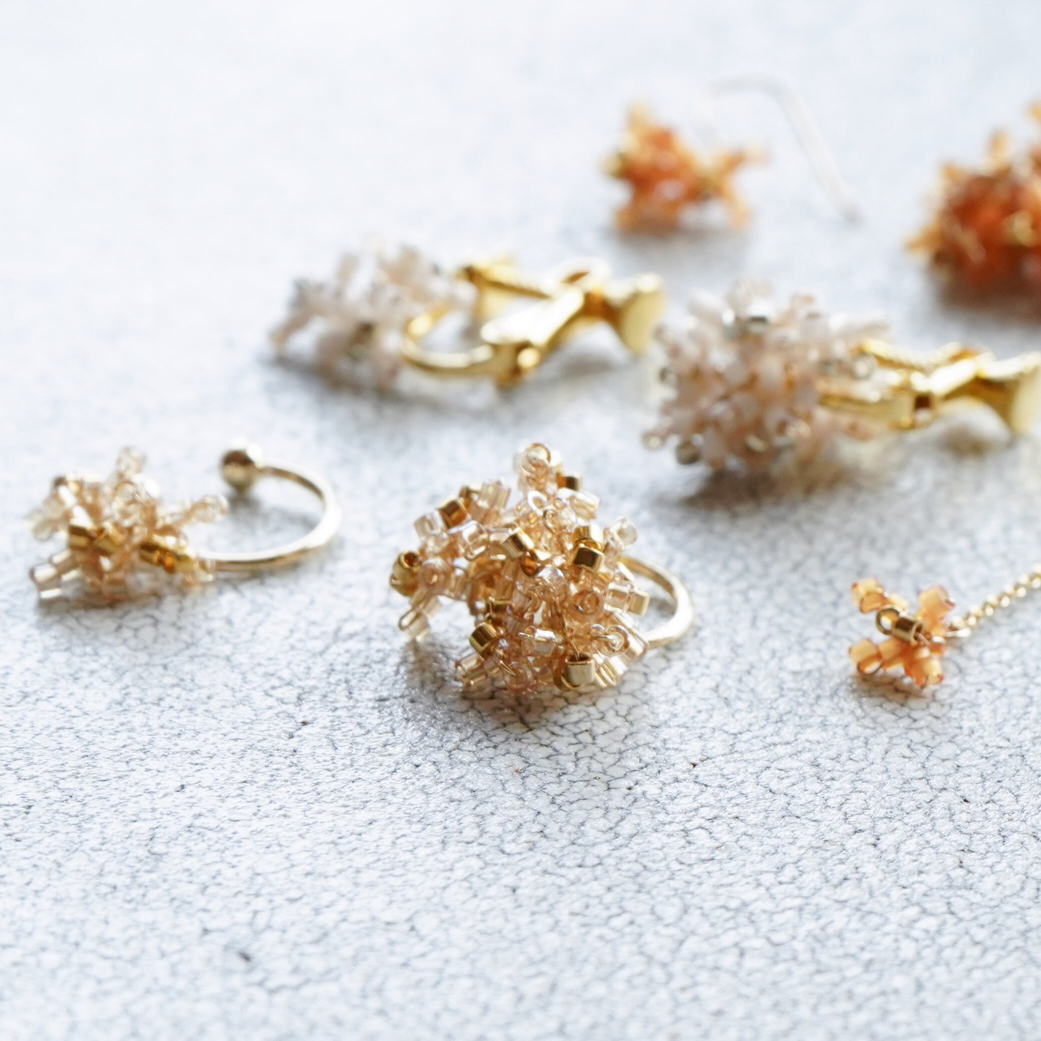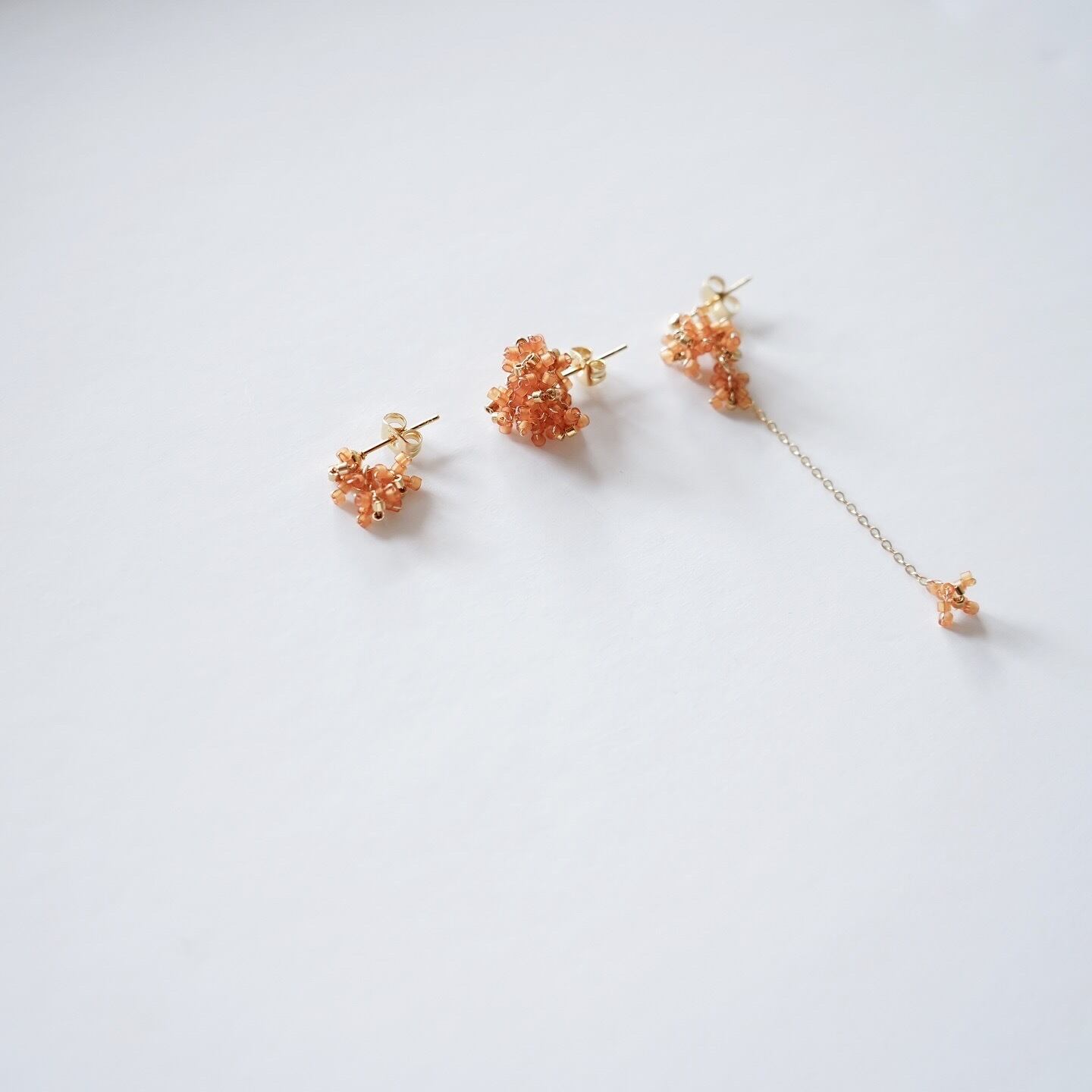 その金木犀の花弁をビーズでかたどって、耳元でささやかに揺れる3つのデザインで表現しました。