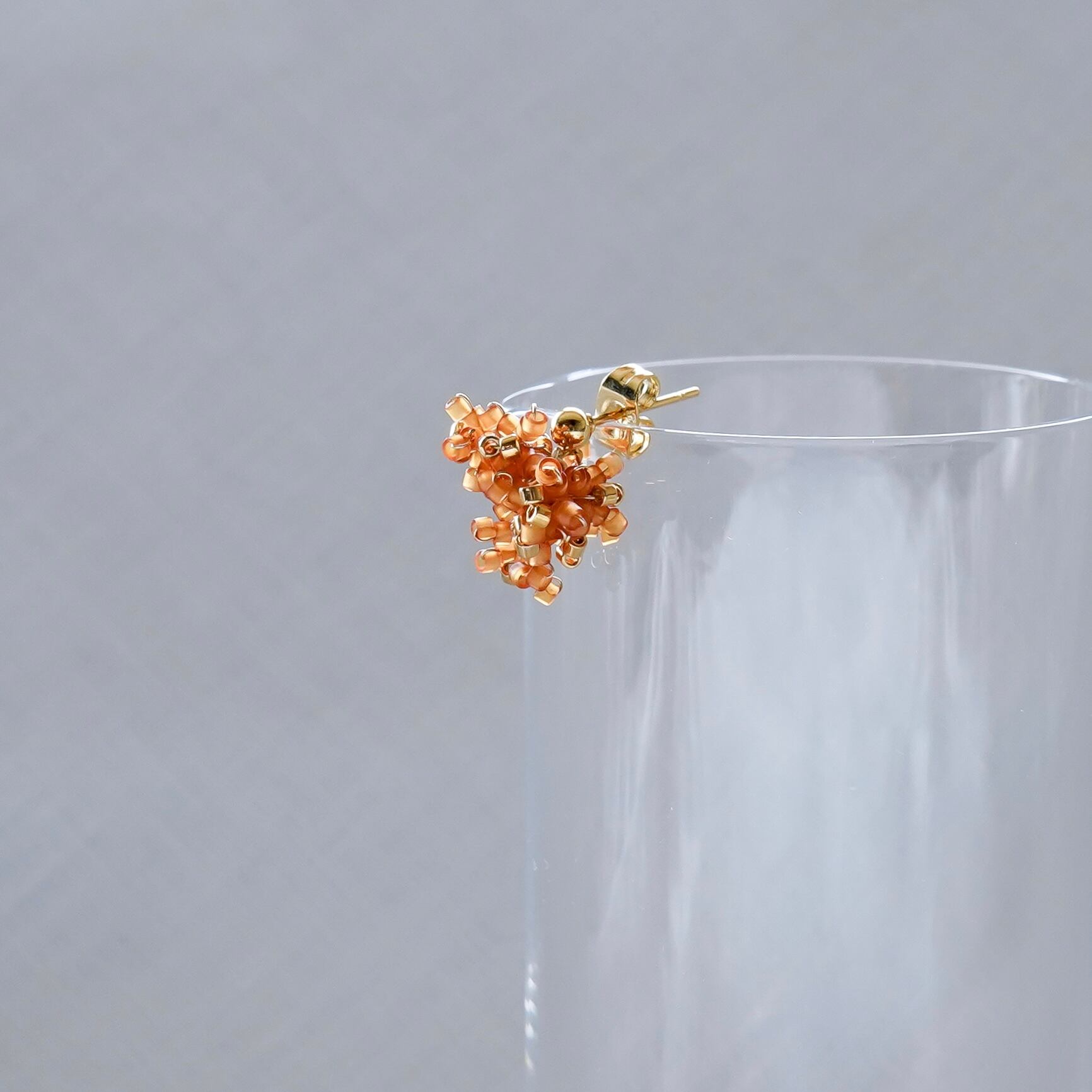 磨りガラスのような加工が施された、こっくりとした深いオレンジ色が美しいビーズで仕立てています。